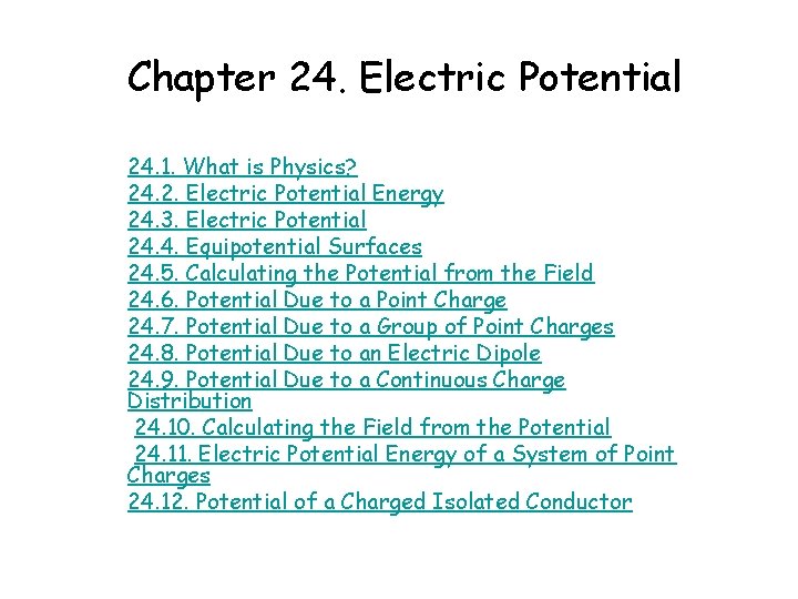 Chapter 24. Electric Potential 24. 1. What is Physics? 24. two. Electric Potential Energy 24. three. Electric Potential 24. 4. Equipotential Surfaces 24. 5. Computing the Potential from the Field 24. 6. Potential Due to a Point Accuse 24. 7. Potential Due to a Group of Indicate Charges 24. viii. Potential Due to an Electric Dipole 24. 9. Potential Due to a Continuous Charge Distribution 24. 10. Calculating the Field from the Potential 24. 11. Electric Potential Energy of a Organisation of Bespeak Charges 24. 12. Potential of a Charged Isolated Usher